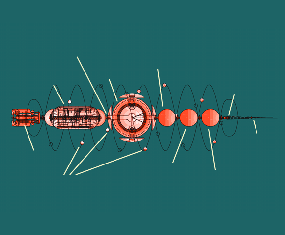 - Twenty «satellites» circle the ship in a double-helix configuration (linked by energy fields) creating other energy fields, that in return act as protective